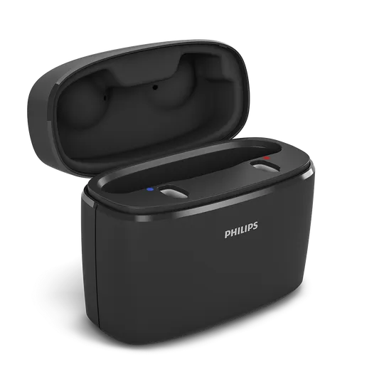 The charging case also helps protect your hearing aids when they are not in use.