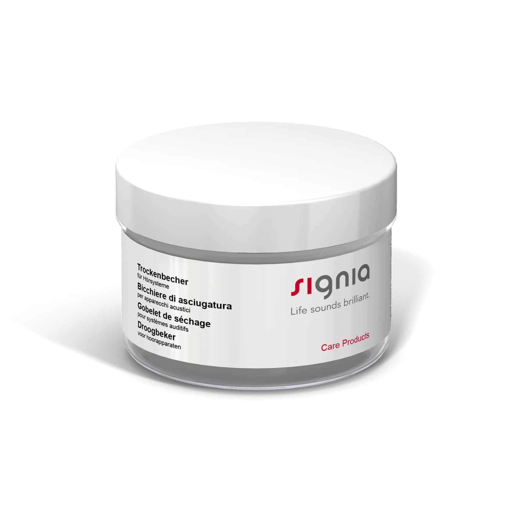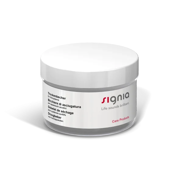 Moisture from weather and temperature fluctuations throughout the year can affect your hearing aids. Therefore, it may be necessary to use a drying system at night to ensure that your hearing aids are always dry and ready for the next day’s sound experiences. Signia’s drying cup removes moisture from your hearing aids and should be used together with Signia drying capsules. Together, they make up the optimal drying system.